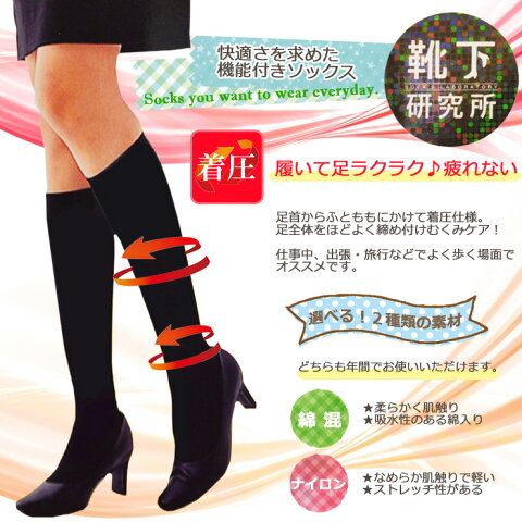 素材 (綿混)ポリエステル・綿・その他 (ナイロン)ナイロン・ポリウレタン サイズ 23〜25cm 特徴 靴下研究所 快適さを求めた機能付きソックス 【着圧】履いて足ラクラク♪
