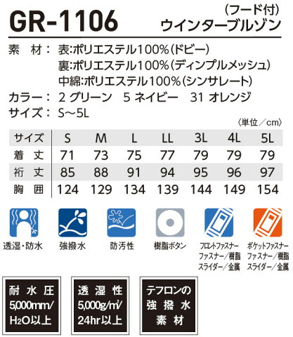 ■S-LL ■3L ■4L ■5L機能説明 ■耐水圧5,000mm/H2O以上、透湿5,000g/m2/24hr以上のドビー素材 ■テフロン加工による優れた防汚、撥水、撥油性 ■中綿は軽量で高い保温性能を誇る3M Thinsulateを使用 ■主要縫製部分に防水テープを使用した本格透湿防水防寒ウェア ■背中にプリントや反射テープが後加工しやすい開閉式ベンチレーション仕様 ■肘部分の立体パターンで快適な動作性 ■寒さを防ぐポイントの襟元にはミニブロックフリースを採用 スペック メーカー タカヤ商事 品番/シリーズ GR-1106/GR-1106シリーズ 商品名 ウィンターブルゾン(フード付) 素材 表:ポリエステル100%(ドビー) 裏:ポリエステル100%(ディンプルメッシュ) 中綿:ポリエステル100%(シンサレート) カラー 2.グリーン(ネイビー) 5.ネイビー 31.オレンジ(ネイビー) サイズ S-5L 加工 サイズ、色等についてのご注意 製品加工の為に、仕上がりのサイズや色等に多少のバラつきがございます。