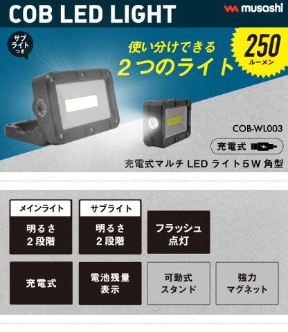 ≪ 商品詳細 ≫ 【品番】COB-WL003 【品名】充電式マルチLEDライト5W角型 【JANコード】4954849992032 【本体サイズ】高さ65mm×幅100mm×奥行30mm 【重量】約150g 【電球】5W LED /1W LED(設計寿命4万時間) 【メインライト 明るさ/電池寿命※】※満充電時 強:500lm/3.5h 弱:80lm/5h フラッシュ: - /3.5h 【サブライト 明るさ/電池寿命※】※満充電時 強:70lm/8h 弱:20lm/12h 【内臓電池】リチウムイオン電池3.7V/1800mAh 【充放電サイクル】500回 【充電時間】3.5時間 【USB端子】micro USB 【設置場所】屋内 【付属品】USBケーブル(充電用)×1(約43cm) 【使用上の注意】 ※ 警告 水のかかるところでは使用しない。